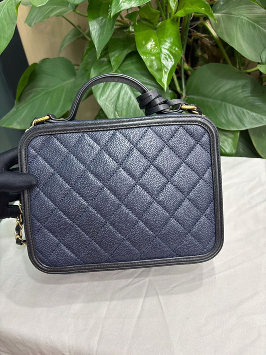 Pre-owned Certified Chanel Medium Filigree Vanity Case in Black and Blue Caviar Leather with Golden Hardware, 2016, w/ dust bag, lock and key