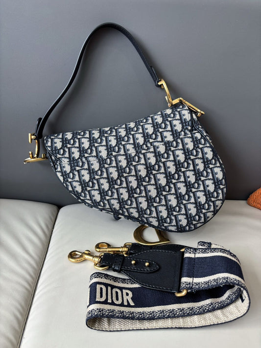 Pre-owned Certified Dior Medium Saddle in Blue Oblique Canvas, 2018, w/ dust bag, strap