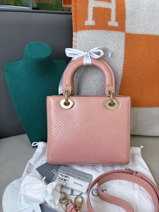 Pre-owned Certified Dior Small Lady Dior in Pink Lizard Skin with Light Golden Hardware, 2018, w/ full set