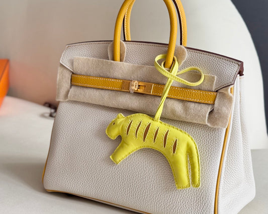Pre-owned Certified Hermes Rooroo Tiger Bag Charm in Yellow and Brown Lambskin