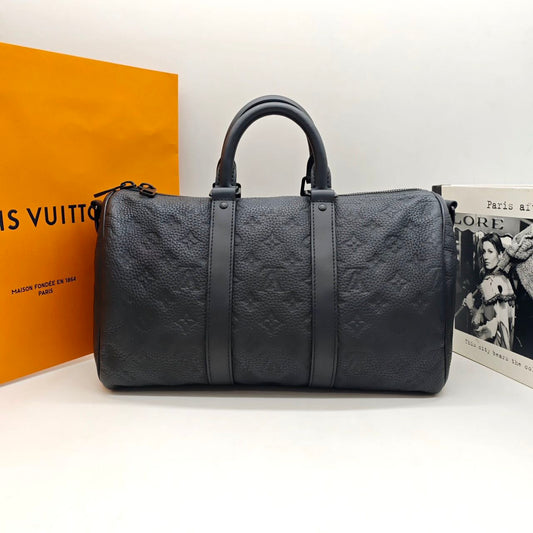 Pre-owned Certified LV Louis Vuitton Keepall 35 in Black Leather with Black Hardware, Microchipped, w/Strap