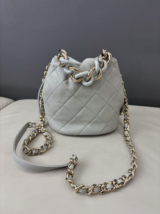 Pre-owned Certified Chanel Quilted Bucket Bag in Gray Calfskin with Golden Hardware, 2022 Microchipped, w/ Dust bag