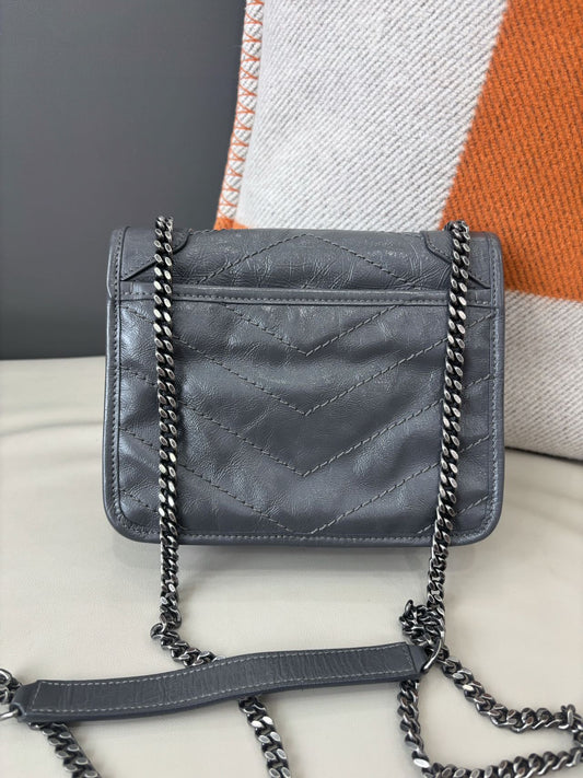 Pre-owned Certified Saint Laurent YSL Baby Niki Bag Gray Vintage Calfskin with Silver Hardware, 2019, w/ dust bag