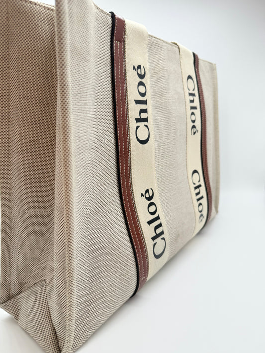 New Gems | Pre-owned Chloe Woody Large Linen Tote Natural Beige and Brown