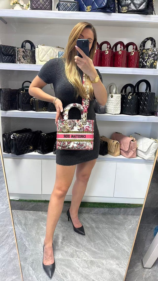 Pre-owned Certified Dior Lady D-Lite Medium Butterfly Floral Embroidered Canvas with Light Golden Hardware, 2021, w/ dust bag, strap