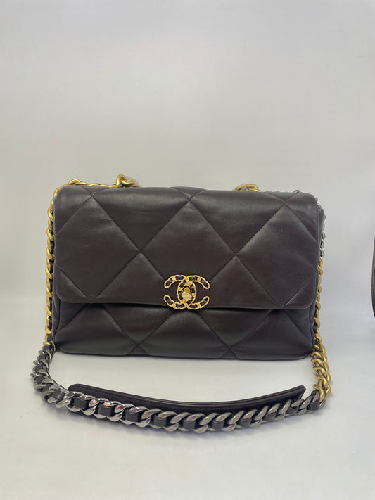 Pre-owned Certified Chanel Medium 19Bag in Dark Chocolate Brown Lambskin with Golden Hardware, 2021 microchipped, w/ Full Set