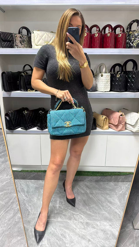 Pre-owned Certified Chanel 19Bag Small Light Blue Tweed with Golden Hardware, 2022 Microchipped, w/ full set