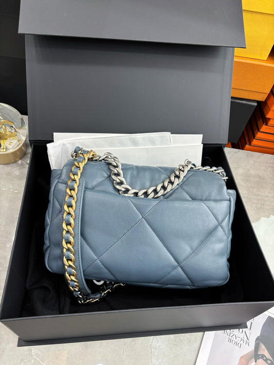 Pre-owned Certified Chanel 19Bag Small Sky Blue Lambskin Silver Hardware, 2023 microchipped, w/ full set