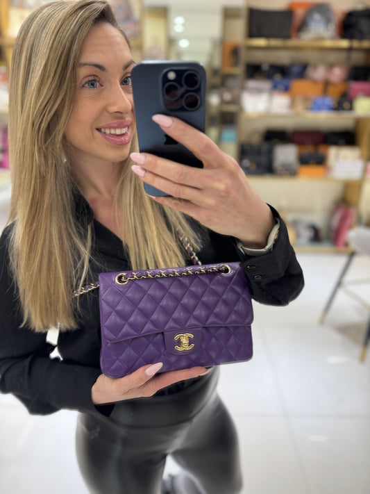 Pre-owned Chanel Classic Flap Small Double Flap Limited Seasonal Edition Royal Purple Caviar Leather Golden Hardware, Microchipped 2022, w/ full set