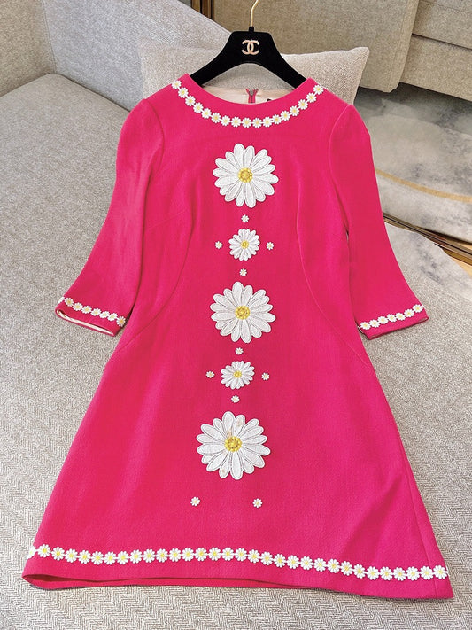Pre-owned Dolce & Gabbana Pink Long Sleeve Tweed Dress with White Flowers, Size 40