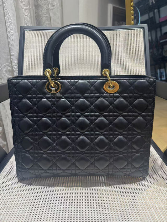 Pre-owned Certified Dior Large Lady Dior in Black Lambskin with Golden Hardware, 2014, w/ strap, dust bag