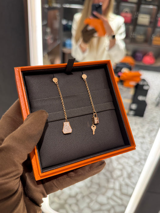 Pre-owned Hermes 18K Rose Gold Diamond Kelly Clochette Drop Earrings, w/ box, certificate