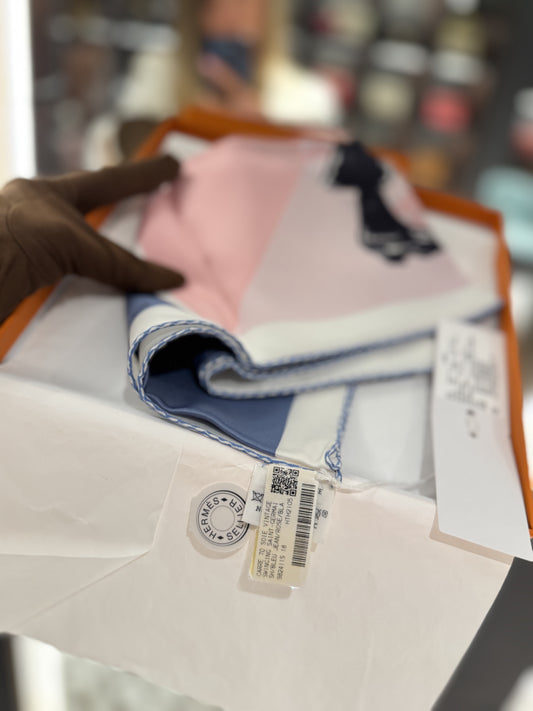 Not Used with Tags Silk Scarf “Swinging Saint Germain”, 70x70 cm, in Blue jean, rose and white