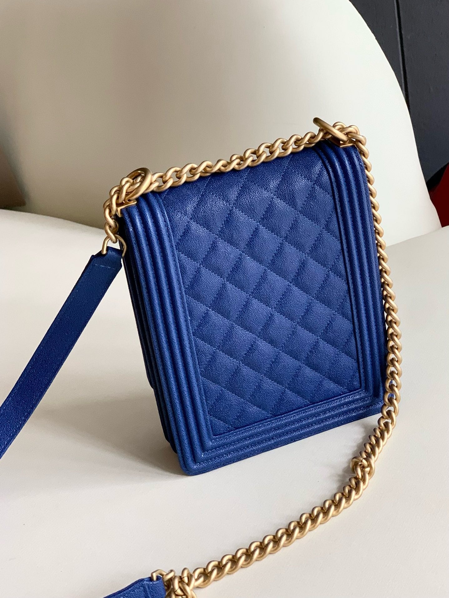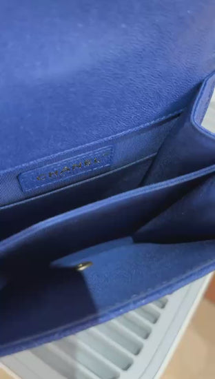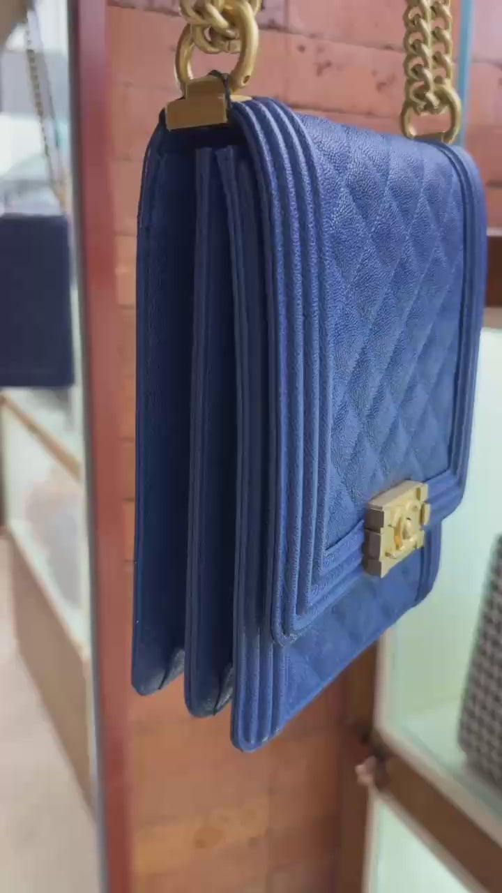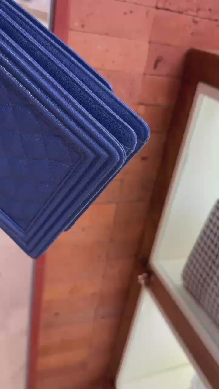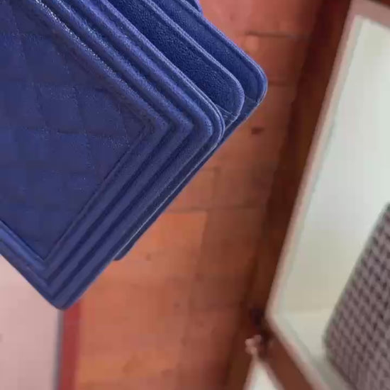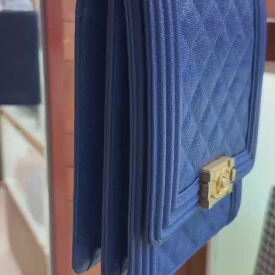 Pre-owned Certified Chanel Boy Bag North South Vertical Blue Caviar Leather Golden Hardware, 2018-2019, w/ Full set - Chanel Box, Dust Bag, Card
