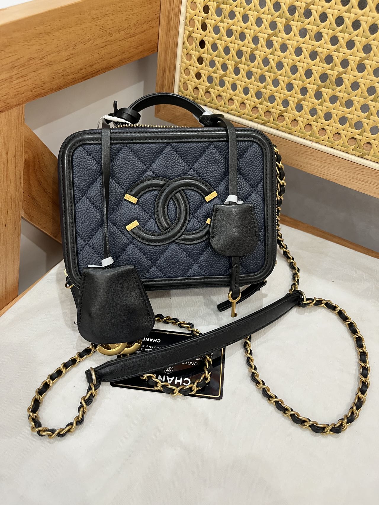 Pre-owned Certified Chanel Filigree Vanity Top Handle Navy Blue Caviar Leather Golden Hw, 2016, w/ Chanel card, dust bag, lock & key