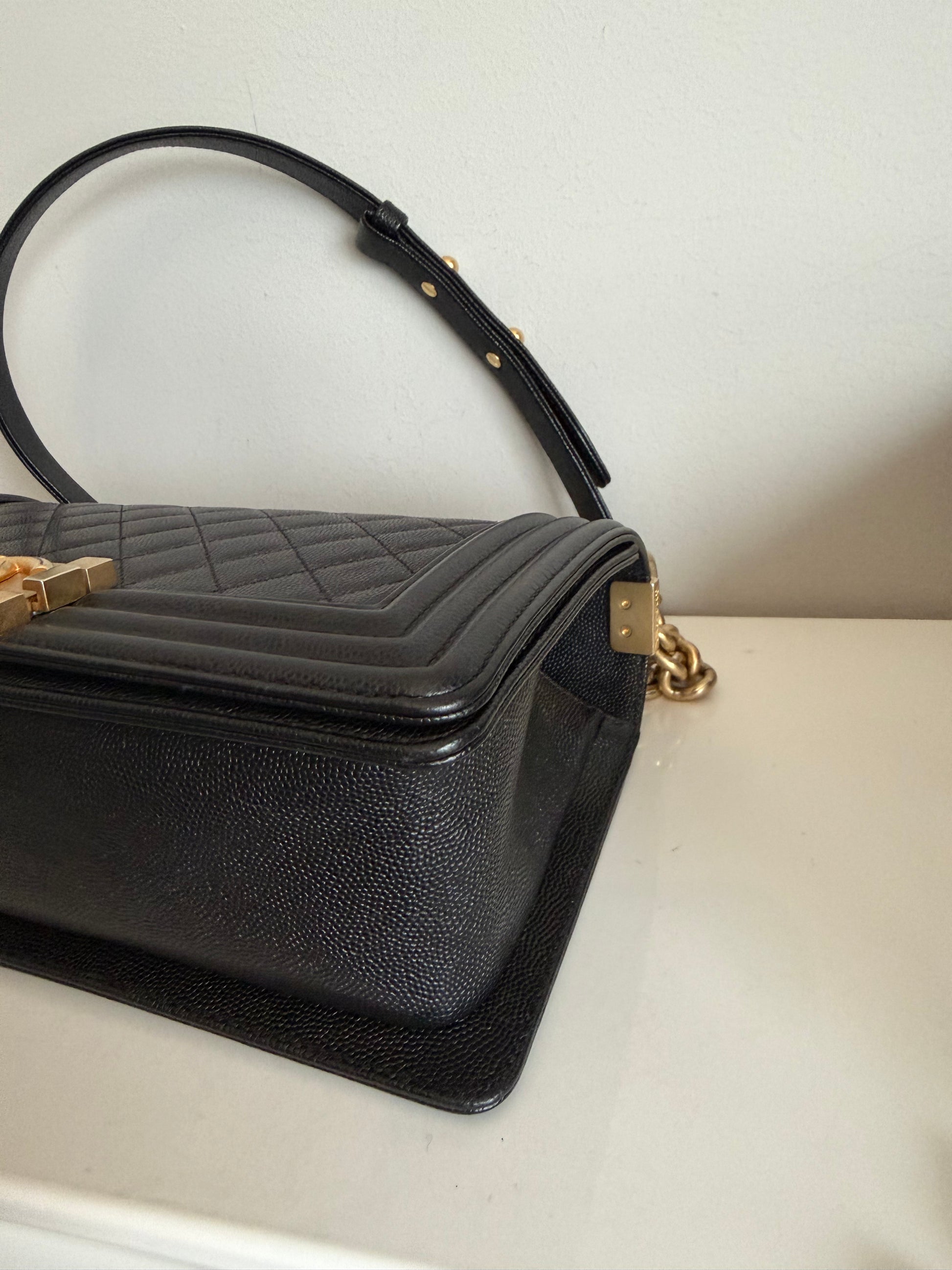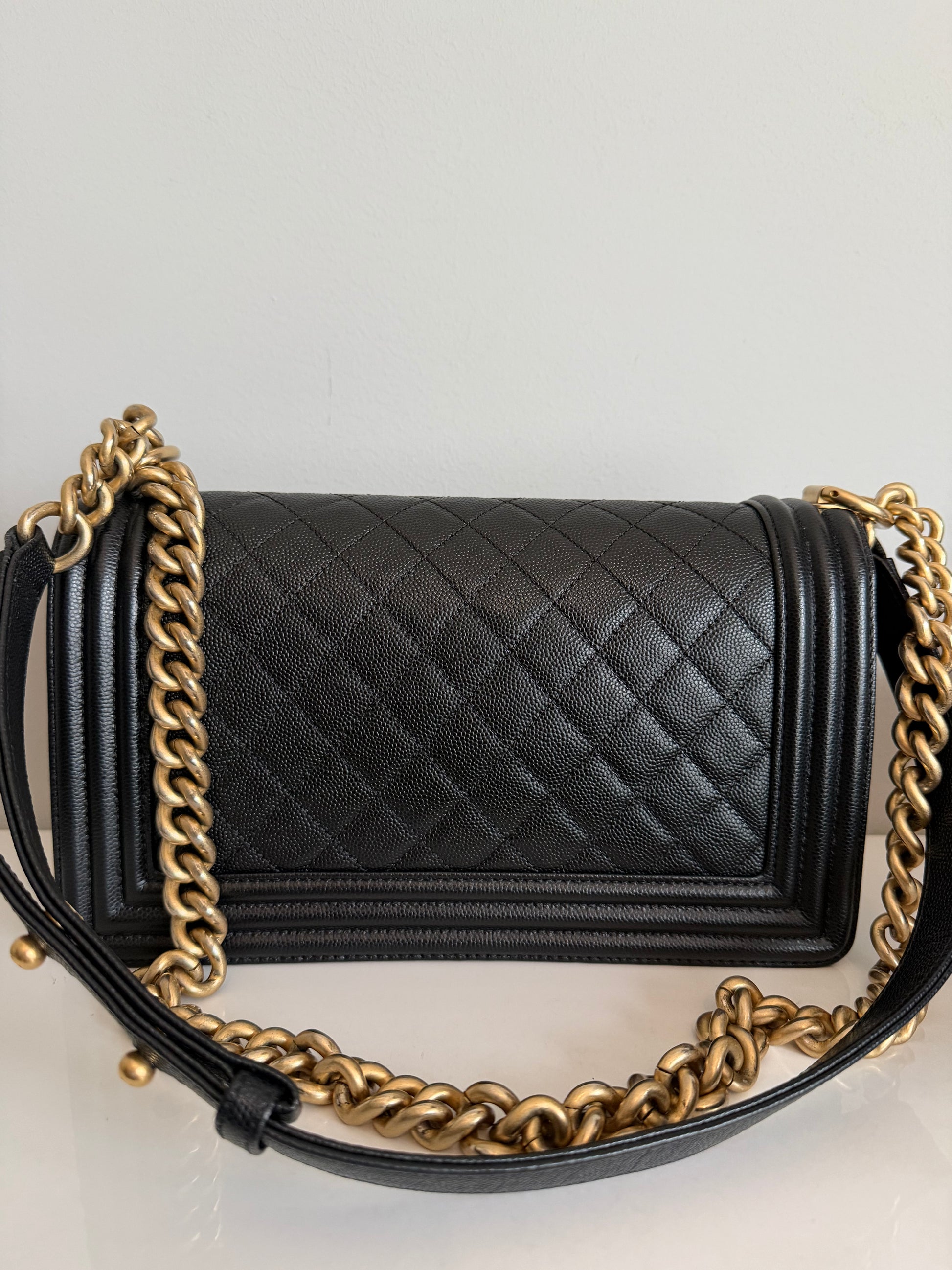 Pre-owned Certified Chanel Medium Boy Bag in Black Caviar Leather with Golden Hardware, 2019-2020, w/ Box, dust bag, authenticity code sticker