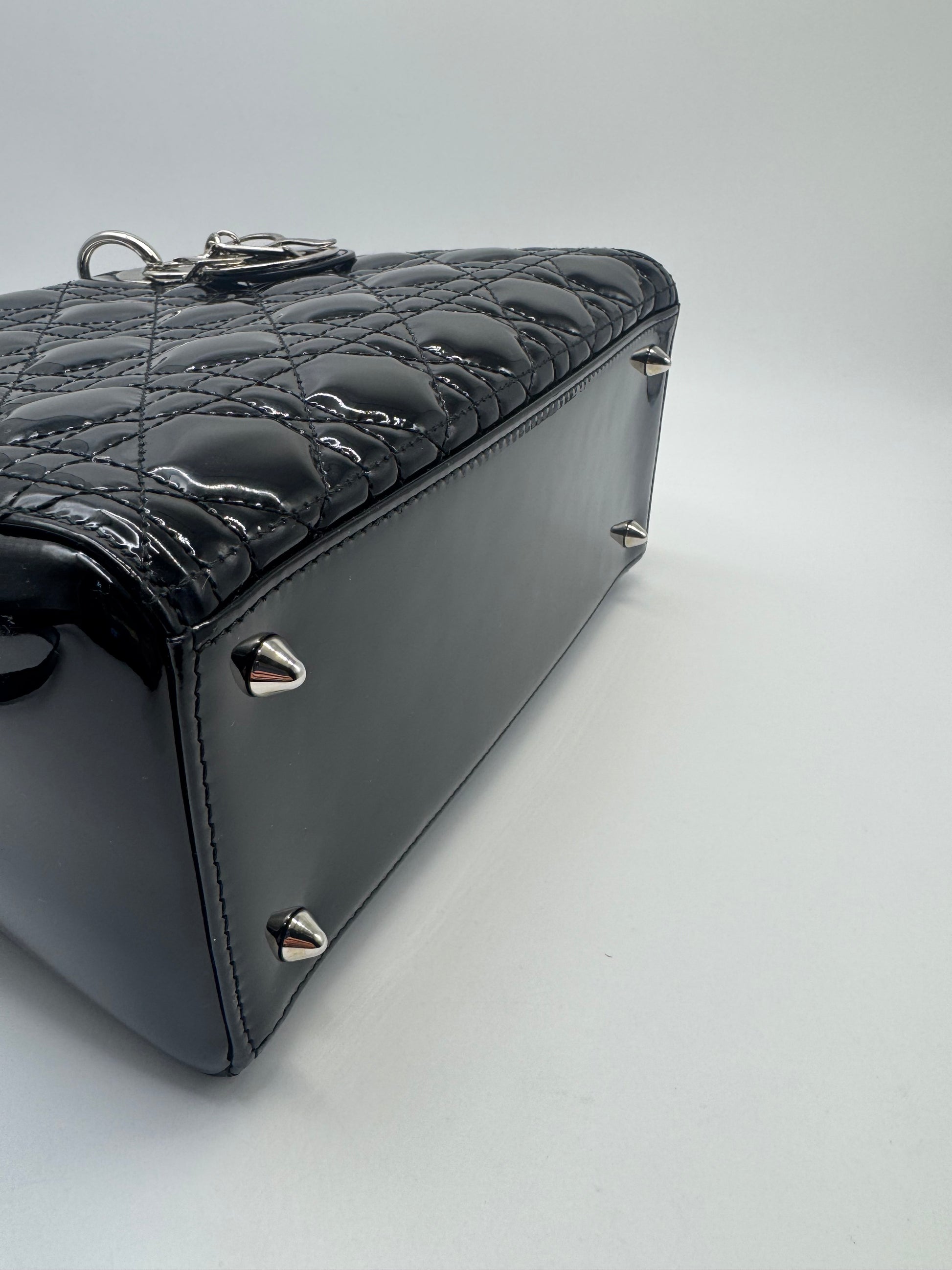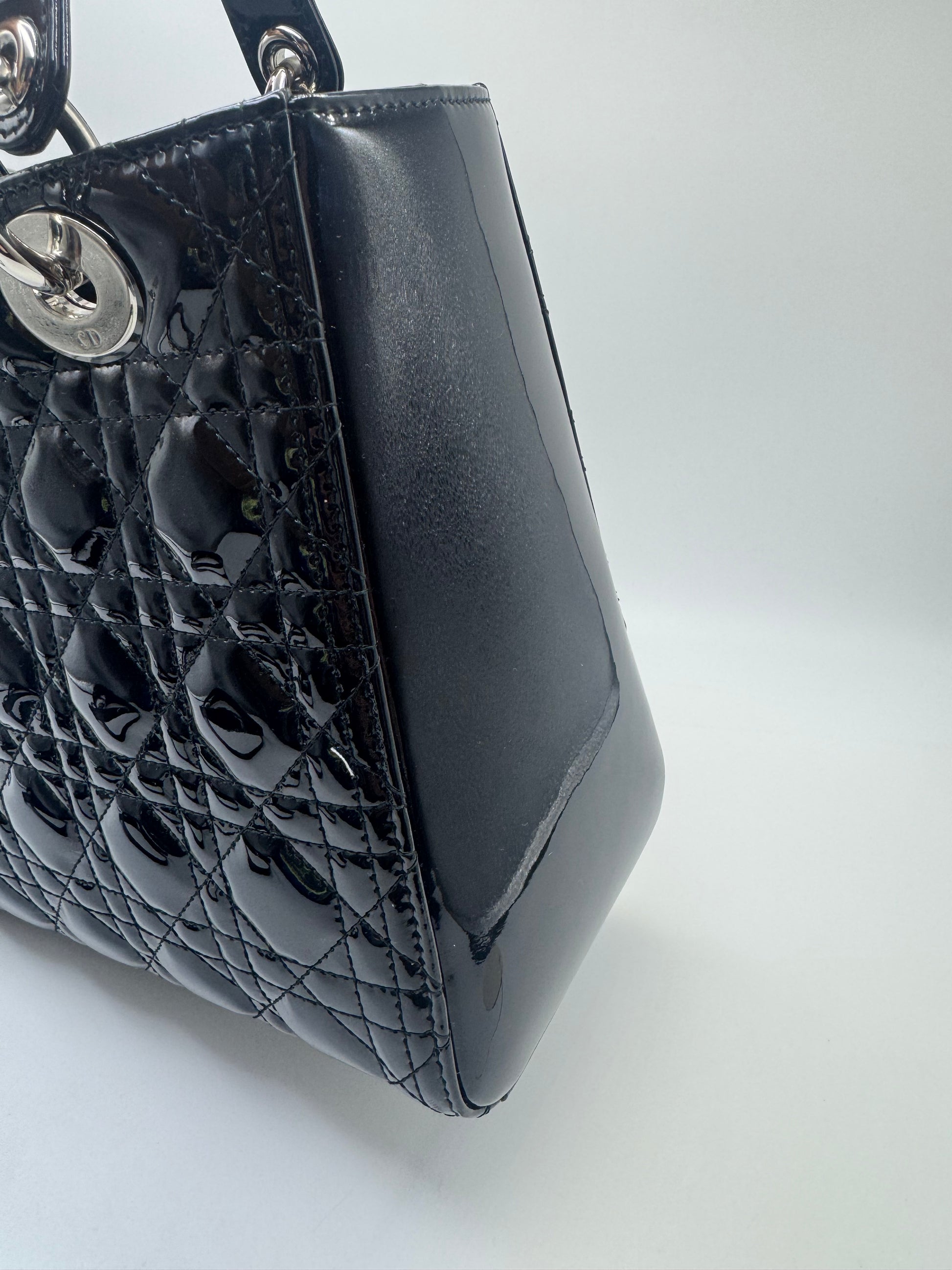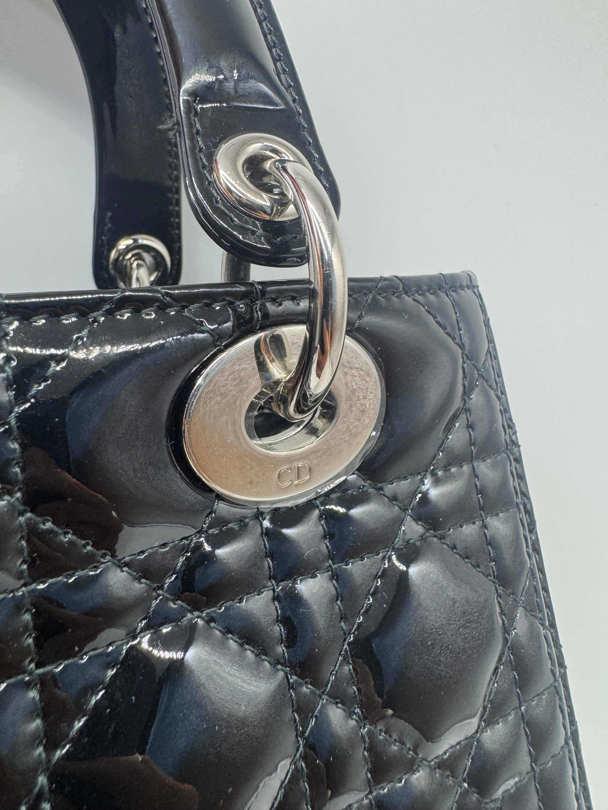 Pre-owned Certified Dior Medium Lady Dior Black Patent Leather with Silver Hardware, 2015, w/ dust bag, strap