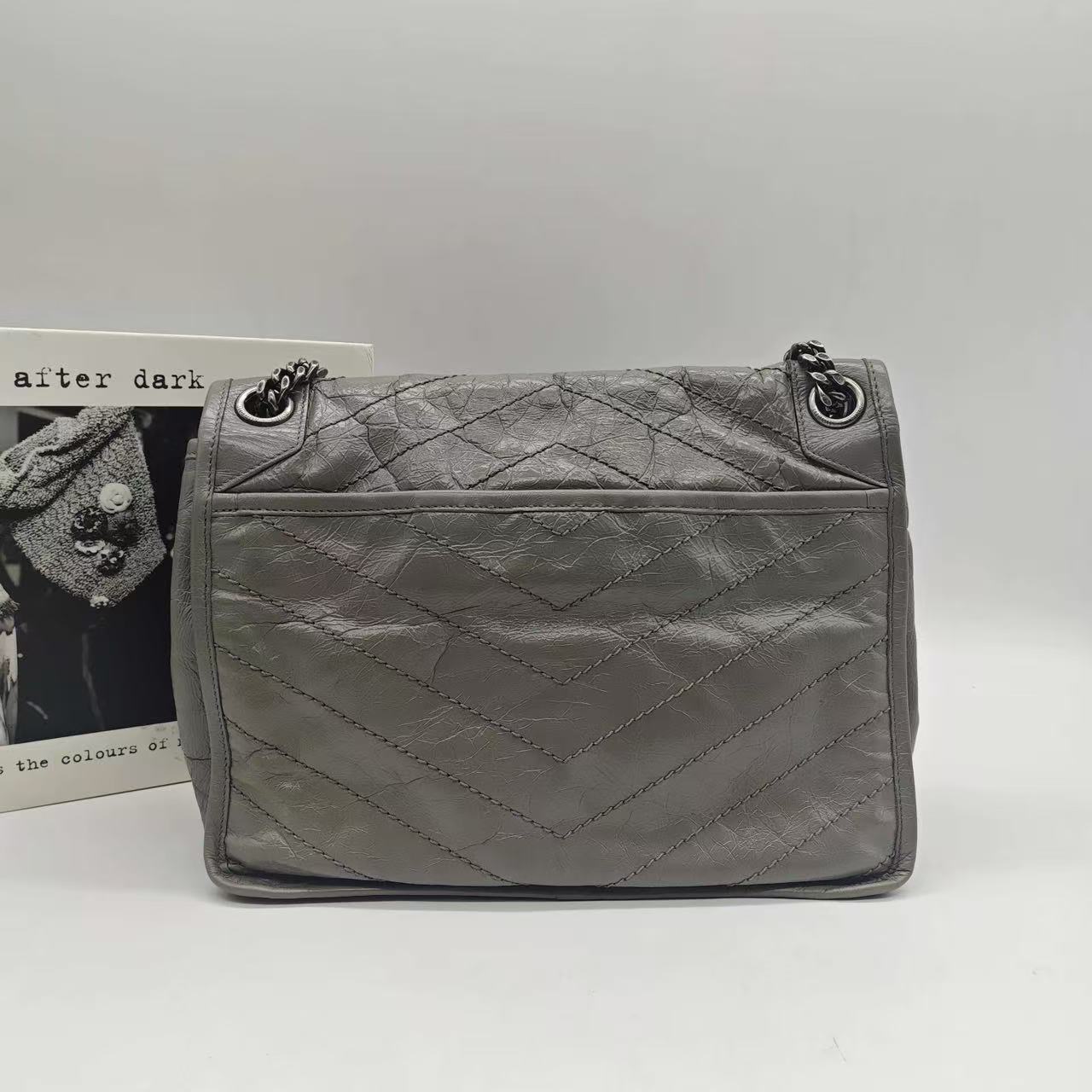 Pre-owned Certified YSL Saint Laurent Niki Medium in Grey Aged Waxy Calfskin with Silver Hardware, w/ dust bag