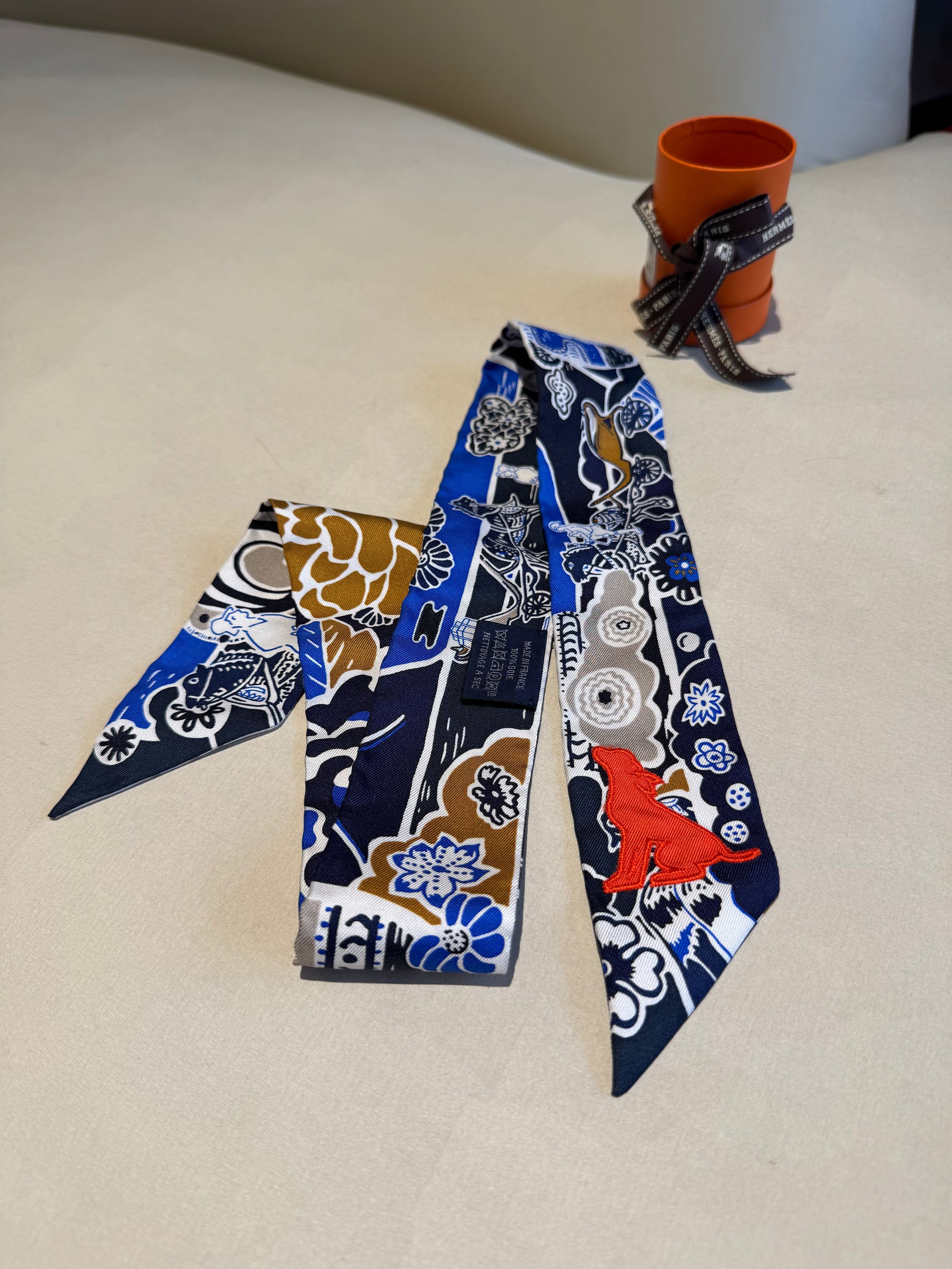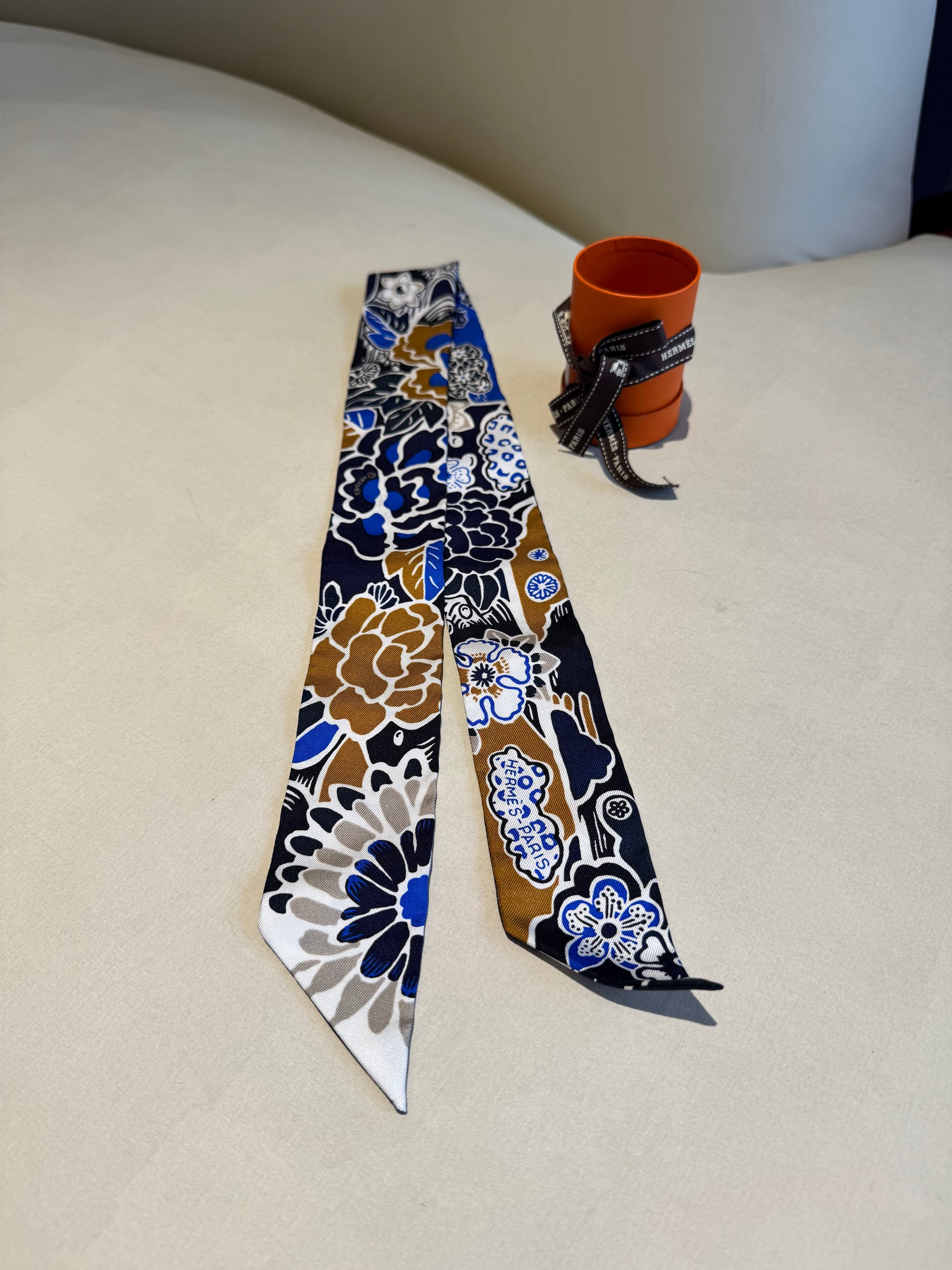 Not Used Hermes Silk Twilly Blue with Browns, w/ box