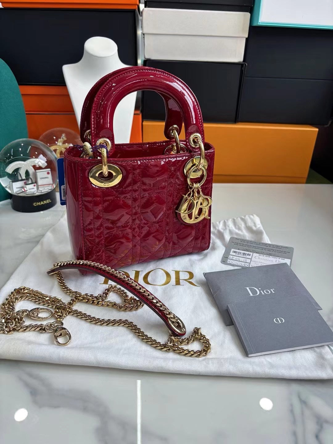 Pre-owned Certified Dior Mini Lady Dior Dark Cherry Red Patent Leather with Golden Hardware, 2019, w/ Full Set - Dior box, card, dust bag, chain