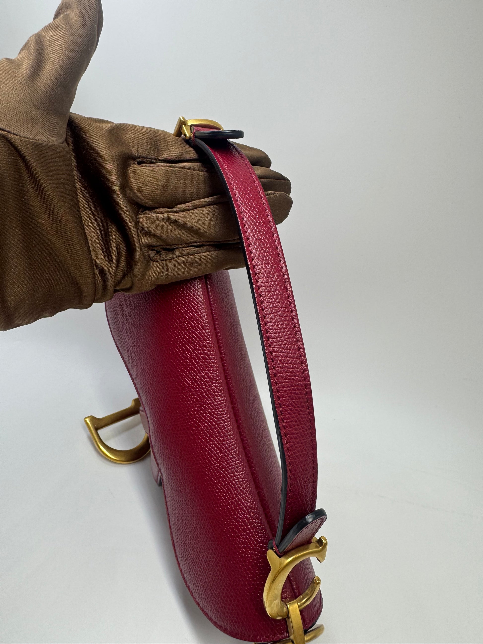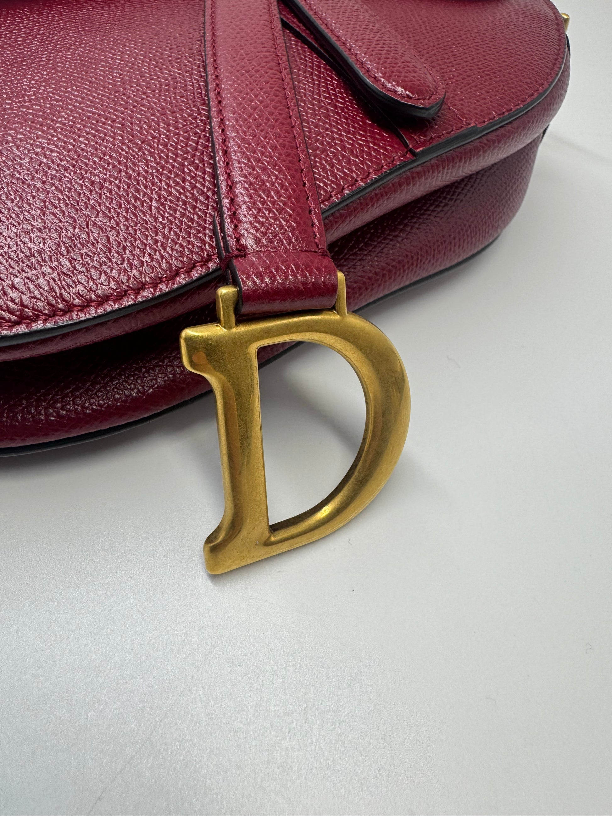 Pre-owned Certified Dior Mini Saddle Burgundy Grained Calfskin with Golden Hardware, set with Canvas Strap, 2019, w/ strap, dust bag